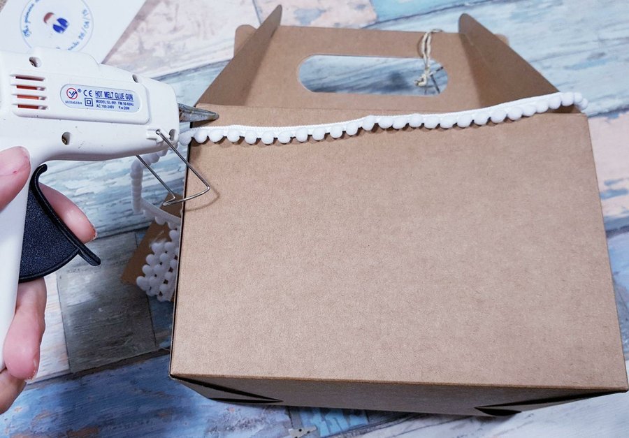 Al ser más grande que el resto de las cajas que he utilizado, les puse varios elementos decorativos. Empecé por pegar una tira de madroños de color blanco por el borde superior.