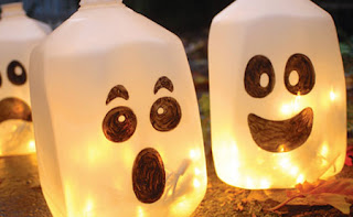 Estas jarras de plastico de leche o jugo son un reciclaje muy bonito , porque sólo les abres agujeros en la parte de atras con un cutter , les dibujas caritas en la parte de enfrente y los enfilas poniendoles series de luces blancas ( de las de navidad ) para alumbrarlas . ¡ genial !