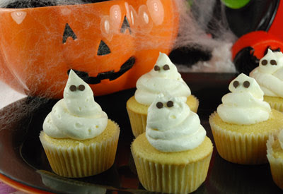 Estos pastelitos de fantasmas puedes hacerlos sin mayor complicación, tienes la opción de comprar las magdalenas o cup cakes ya hechos o prepararlos tu misma con tu receta fávorita, luego con una manga de orificio pequeño vas rellenando como se ve en la foto con el pudín de tu predilección , dando la forma de fantasma , poniendo como ojos chispas de chocolate, mantenlos refrigerados hasta servir .