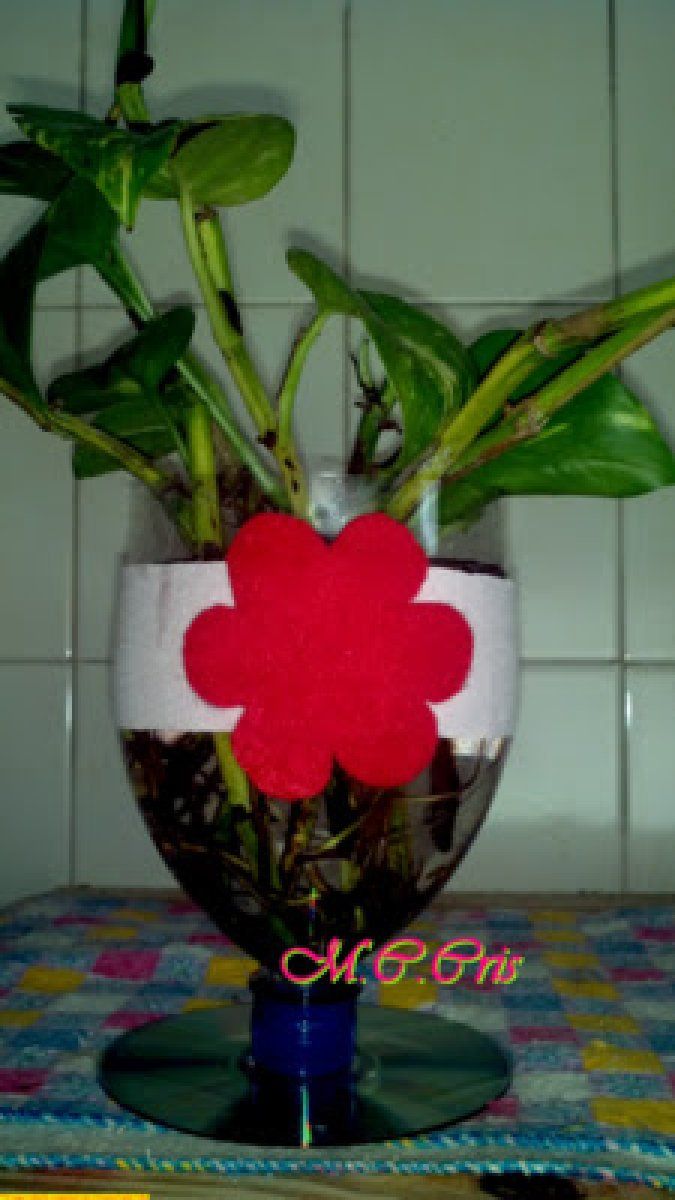 La usuaria Crisaprendiendo ha recortado una botella de plástico por la mitad y le ha dado la vuelta. Introduciendo el tapón por el hueco del cd ha hecho la base, dándole apoyo suficiente para mantenerse de pie. Con todo ello ha creado un fantástico florero, el cual ha adornado con papel y fieltro.