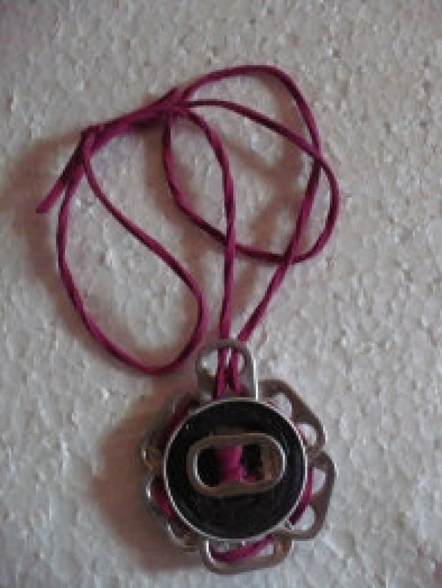 La usuaria Charoji ha diseñado estos collares con una capsula negra y rodeada de anillas de latas de bebidas a los lados y otra más en el centro. Por una de estas chapas ha colado un cordón que hace la vez de cadena. Par combinarla ha utilizado un color granate a juego con el resto de la obra.