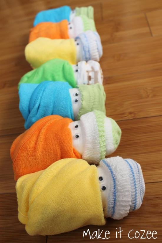 Luego decora con ropita y productos de bebes atándolos con las cintas.