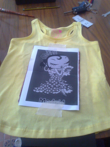 Paso 1º: Colocamos la camiseta sobre una superficie lisa, ponemos el papel de calca en el sitio donde queramos poner nuestro dibujo, y se sitúa el dibujo encima y a calcar repasando el dibujo por encima con el lápiz.