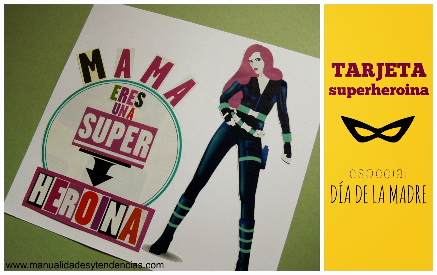 Aprovecha recortes de revistas para hacer un improvisada tarjeta scrapbook, como esta de mamá súper heroína. Puedes verla aquí.