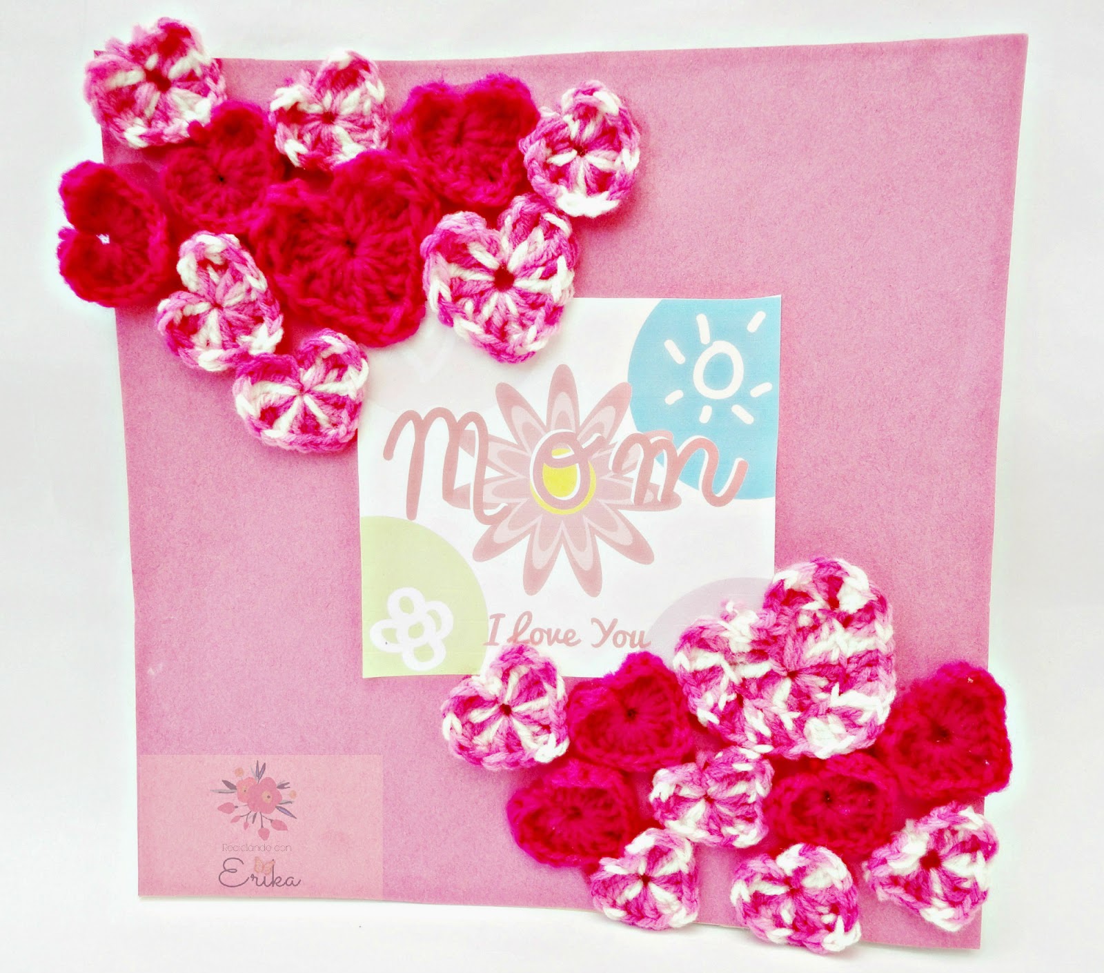 Mezcla los imprimibles con elementos tradicionales como el crochet para hacer esta bonita tarjeta para felicitar a mamá cualquier día del año. Puedes descargarla aquí.