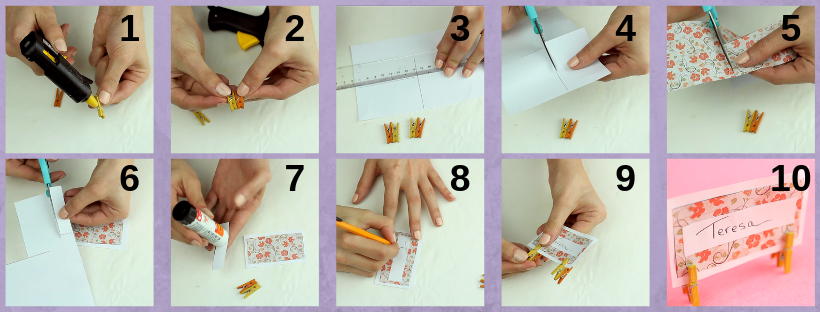 4. Pegamos todos los trozos de papel por tamaños, escribimos el nombre, agarramos las pinzas por la parte inferior del cartel y ¡lo tenemos!