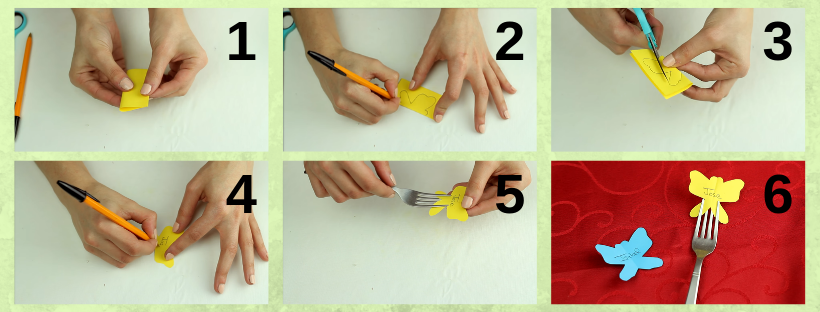 3. Para finalizar, introducimos la mariposa entre las puntas de un tenedor y ¡listo para colocar en la mesa!