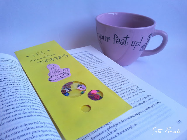 Me encanta este alegre marcapáginas con mensaje de la Srta. Pomelo, dan ganas de acurrucarse a leer con una tacita de té/café/chocolate caliente: