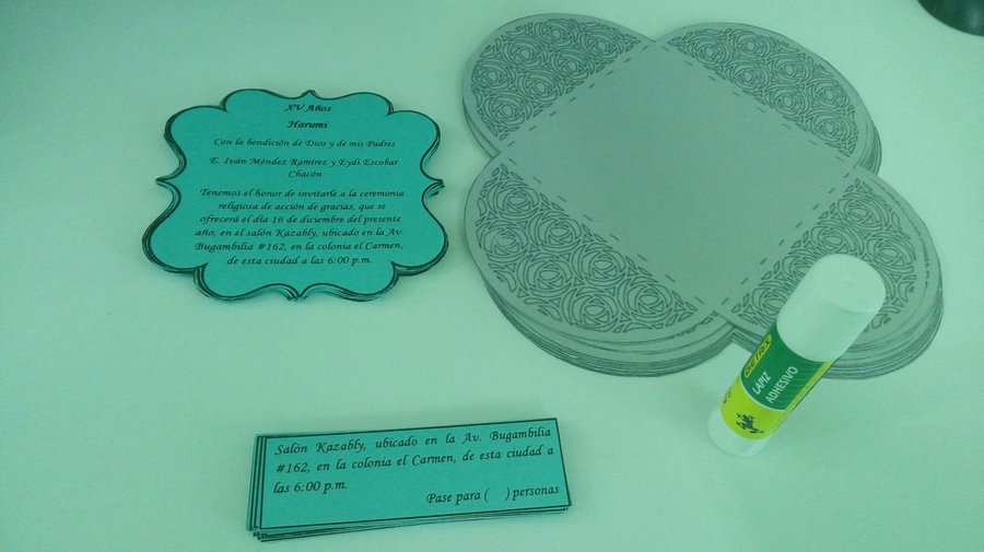 el trabajo de web, reside en limpiar y dejar a medida cada figura para que empate bien una sobre otra y claro lo mas importante el texto de la invitacion, ya que tenemos estas listas, mande a imprimirlas en un centro especializado para ploteo y folios grandes.