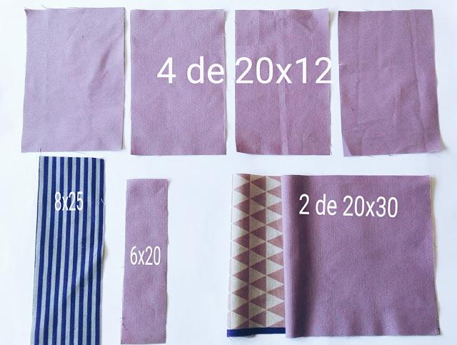 Telas: dos telas de 20×30 para interior y exterior, cuatro trozos de tela para los bolsillos de 20×12, un trozo para los anillos de 8×25, un trozo de tela de 6×20.