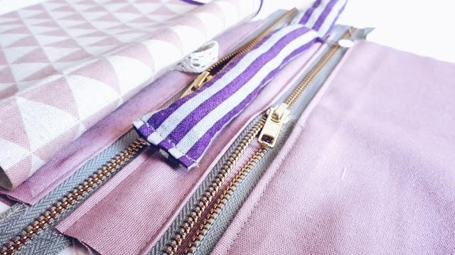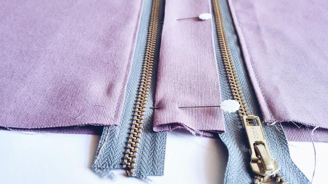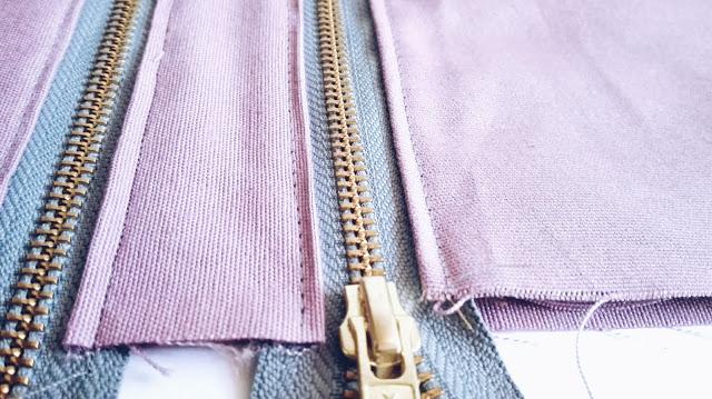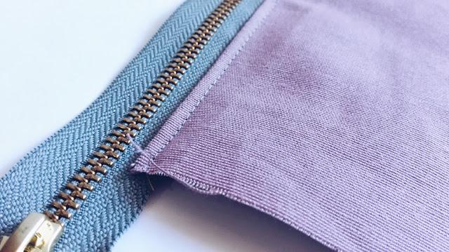 Primero coserás las dos cremalleras creando unos bolsillos. Coloca la telas exterior con el frente hacia arriba, la cremallera con el frente hacia abajo y la tela interior con el frente hacia abajo formando un sándwich. Y pasa un pespunte recto.