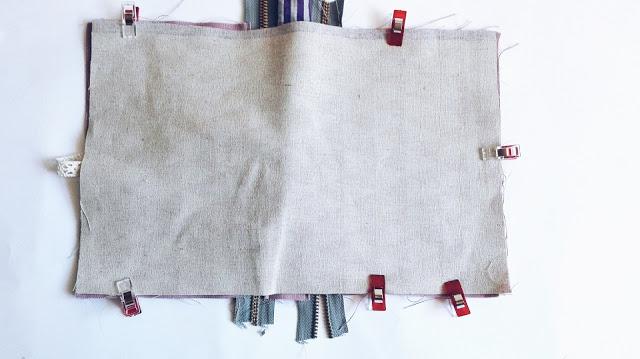 Para unir estos bolsillos necesitarás el trozo de tela de 6 x 20. Con la plancha hazle un dobladillo de medio centímetro a cada lado a lo largo de la tela. Colocalo sobre las cremalleras y cose por los dos extremos.
