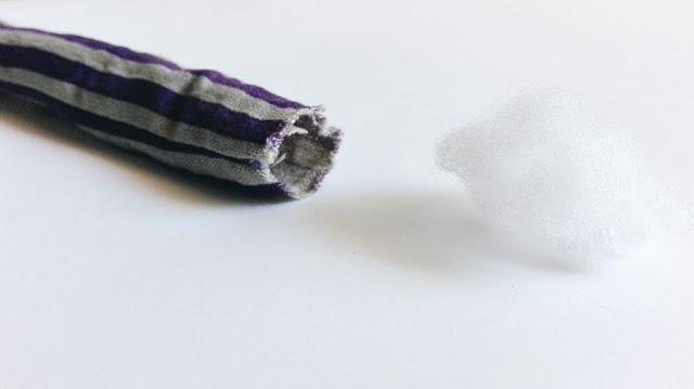 Ahora haremos el sortijero con la tela de 8 x 25. Haz un pespunte recto a lo largo con los frentes hacia adentro, después dale la vuelta y mete el relleno de cojín.