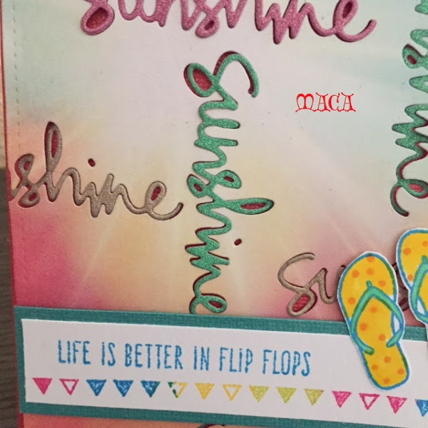 Pues bueno esta semana os traigo dos tarjetas, aunque una no se si llamarla tarjeta, la primera , con uno de los papeles del kit, en el que troquele varias veces en distintas direcciones la palabra sunshine, después en varios colores de papel con brillanatina de la heidi swap que me rechifla volví a troquelar la palabra y la puse en el lugar del papel que había troquelado anteriormente.