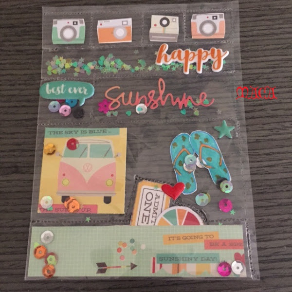 pues bien en el kit venia una un sobre de plástico transparente, con mucha paciencia y el photo sleeve tool fui haciendo bolsillitos, metiendo recortitos de los papeles , lentejuelas etc.