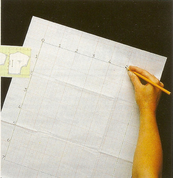 3. Para dibujar el patrón, decidir un lugar conveniente como punto de partida; ejemplo, la línea del escote. Utilizar los números como guía para localizar su posición en el rectángulo, en sentido horizontal y vertical; marcar la posición con una X. Marcar todos los puntos que crucen las líneas y también el lugar donde éstas cambien de dirección (ejemplo, al final de la manga).