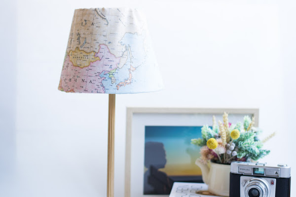 Materiales: Lámpara, tela, pegamento, tijeras, pintura en sprayYo ya había pintado años antes, el pie de la lámpara de color blanco. Y decidí darle un toque con pintura dorada. Luego con la tela de mapas que había comprado hace meses, forre la tulipa con pegamento textil.