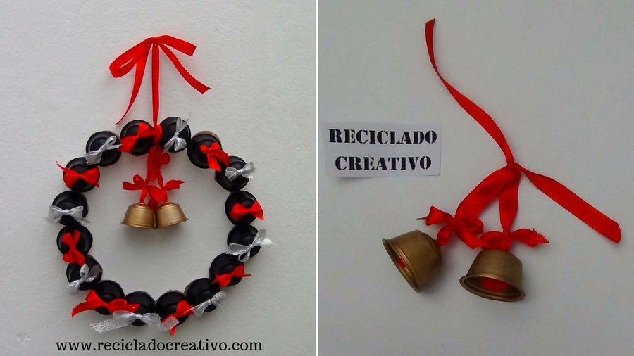 La corona la podemos decorar con unas campanillas, también realizadas con las mismas cápsulas, en esta ocasión las pinté para dar un aspecto dorado y metálico.