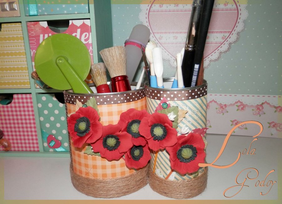 Para realizar este trabajo creativo necesitarás: Latas de conservas, papel de scrap, cuerda de esparto, cinta y flores de porcelana fría.