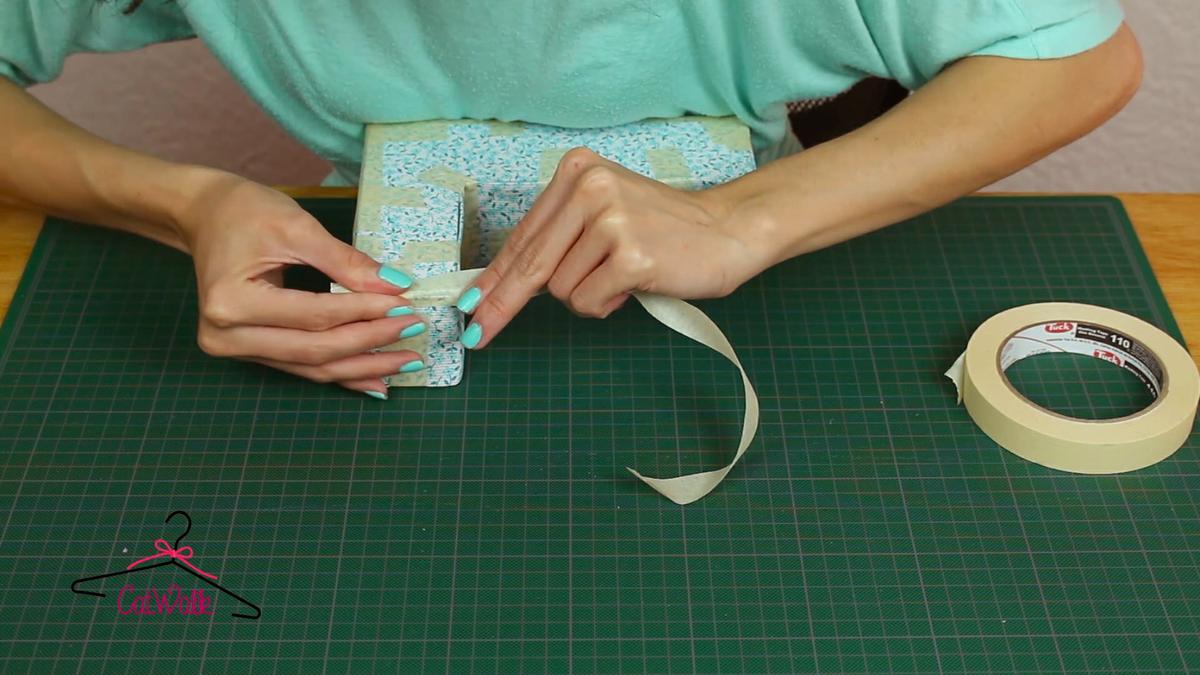 Para saber cuánto material vamos a necesitar para cubrir el canto, vamos a ocupar la cinta métrica. La ponemos sobre la letra (yo les recomiendo pegarla con pedacitos de cinta adhesiva para que no se mueva y sea más fácil medirla) y la corremos por toda la letra hasta llegar a la punta de inicio. Con la medida de la letra cortamos la tira de papel estraza o cartulina y con un ancho de 5 cm. De igual forma cortamos la tela dejando 3 cm más por lado y la pegamos al papel estraza. Es importante que las esquinas de la tela la cortemos en diagonal y después peguemos el exceso de tela en la parte de atrás de nuestro papel estraza, esta tarea es más fácil si nos ayudamos de la espátula.