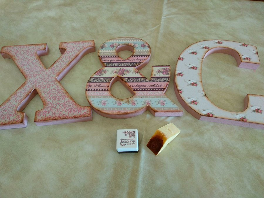 6- Para darle un toque vintage envejecido, con la tinta de estampar y una esponja de maquillaje, le damos unos toquecitos por todo el contorno de la letra.