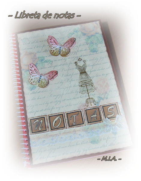 Os pngo una libreta sencilla, de estilo vintage roámtico y que me ha encantado el resultado.Sobre un papel (no sé como se llama) he embosado en polvos oro una silueta de maniquí. Como complemento unas mariposas troqueladas del modelo de Marta Stewart entintada con un mezcla de varias tintas distress.Unas letras formando la palabra NOTAS sobre un lazo de organza y un encaje en el que pegué pequeña ...