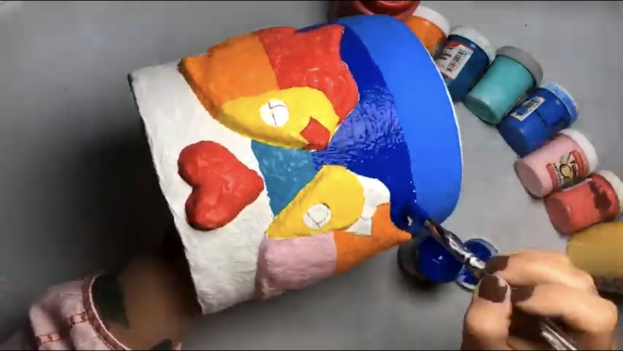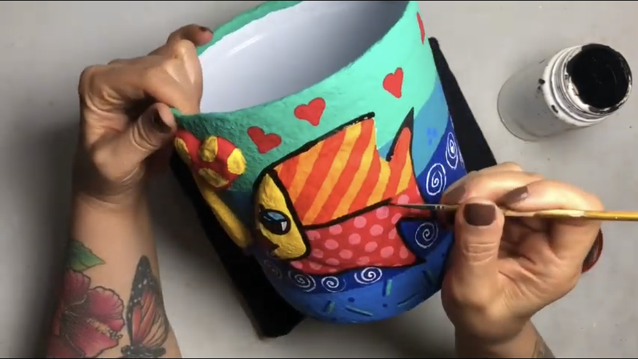 Le aplico dos capas de acrílico de base color claro y hago trazos guías para aplicar todos los colores