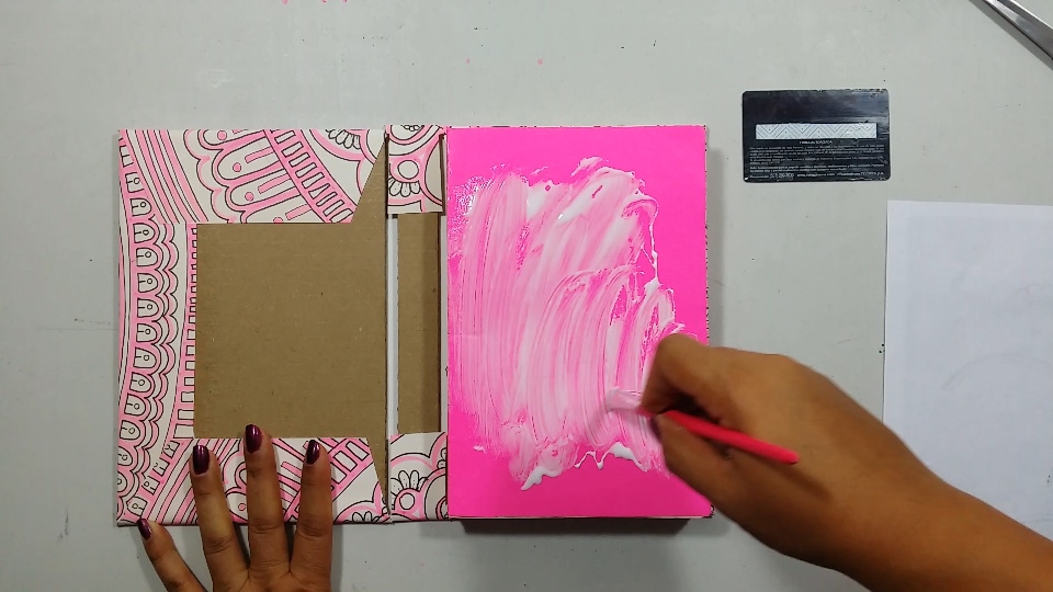 Como les había comentado voy a utilizar esta cartulina para hacerle la portada o caratula a esta libreta, pera esto recorte un par de rectángulos de carton, (para esto use una caja de reciclaje) los rectángulos tienen como medida el ancho total del cuaderno mas 0.5 cm y el alto total de la libreta mas 1 cm