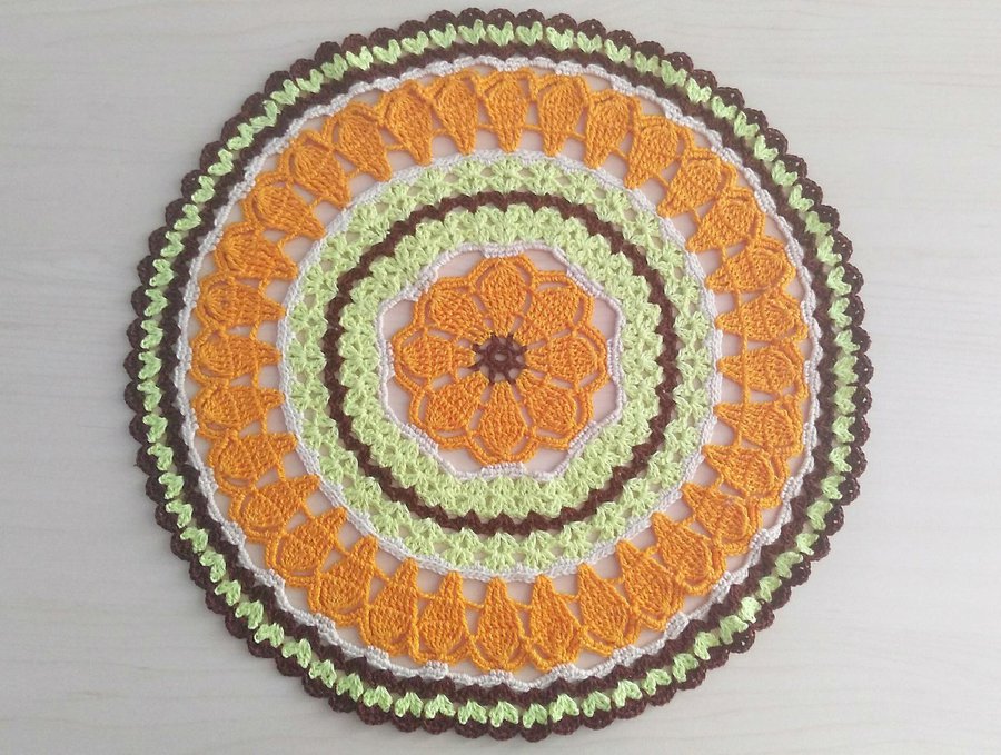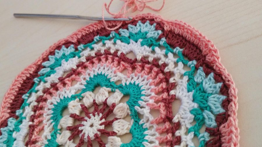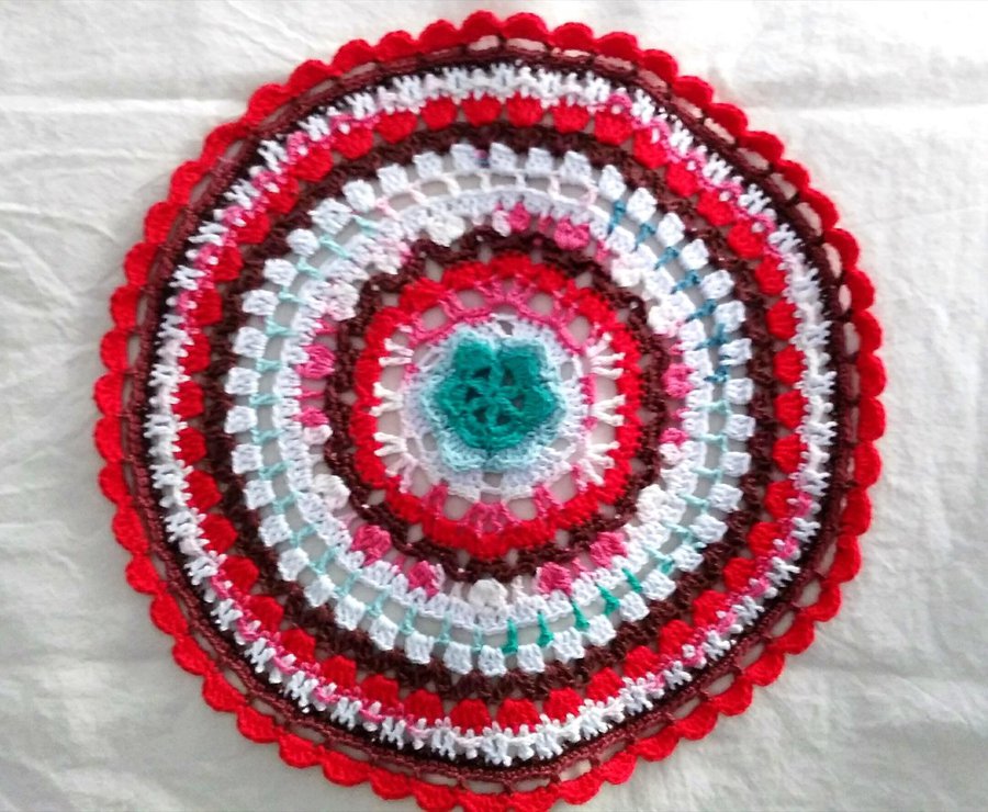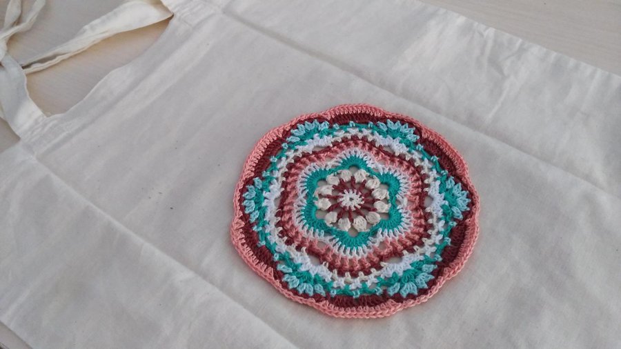 Yo siempre llevo en el bolso una bolsa de tela para pequeñas compras. La he decorado a ganchillo con un mandala.