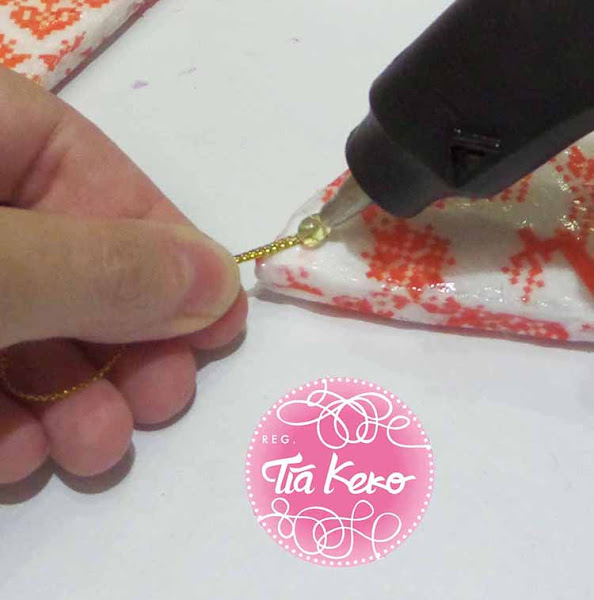 Cuando cada árbol está personalizado ponemos una cinta, por detrás de la figura con silicona caliente, para poder colgarlo en las ramas del árbol de Navidad.