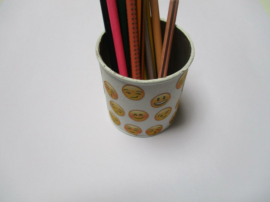 Pinta la lata de metal redonda de color blanco deja secar imprime el emoticon que mas te guste y con un poco de pegamento en barra procede a pagarlo.