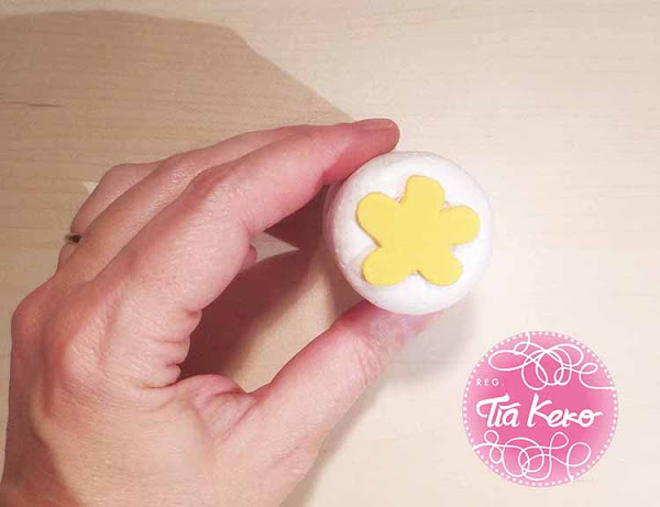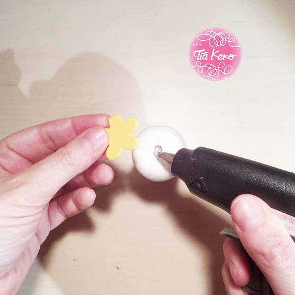 Una vez tenemos la flor recortada, vamos a pegarla a la base de corcho blanco con silicona caliente