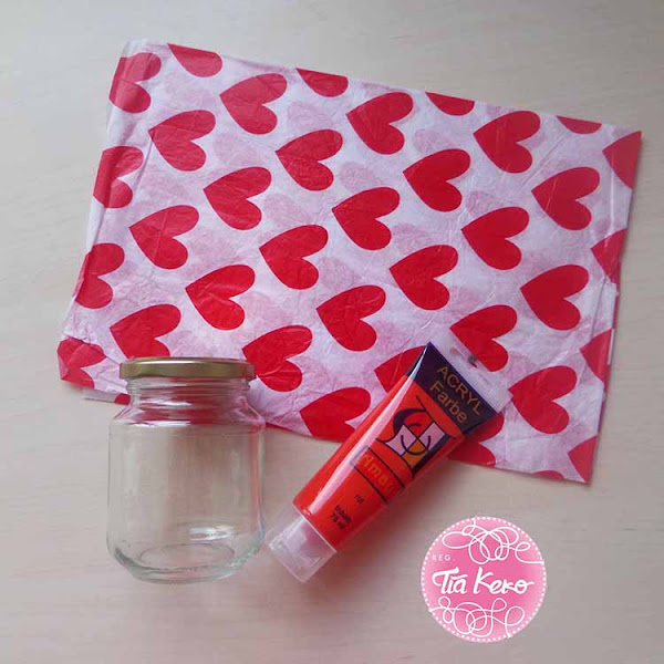Una vez tenemos un bote de cristal vacio y limpio vamos a decorarlo con corazones, para ello hemos cogido de papel seda decorado con corazones grandes. Para nuestro tarro hemos necesitado cinco corazones que vamos a pegar al tarro de cristal por fuera gracias al pegamento decoupage.