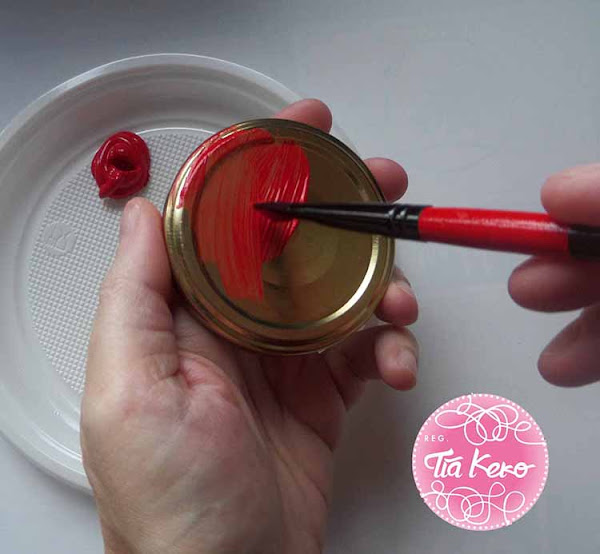 Cuando hemos terminado con el bote vamos a decorar la tapa, para ello vamos a pintarla de color rojo para que contraste con los corazones del cristal.