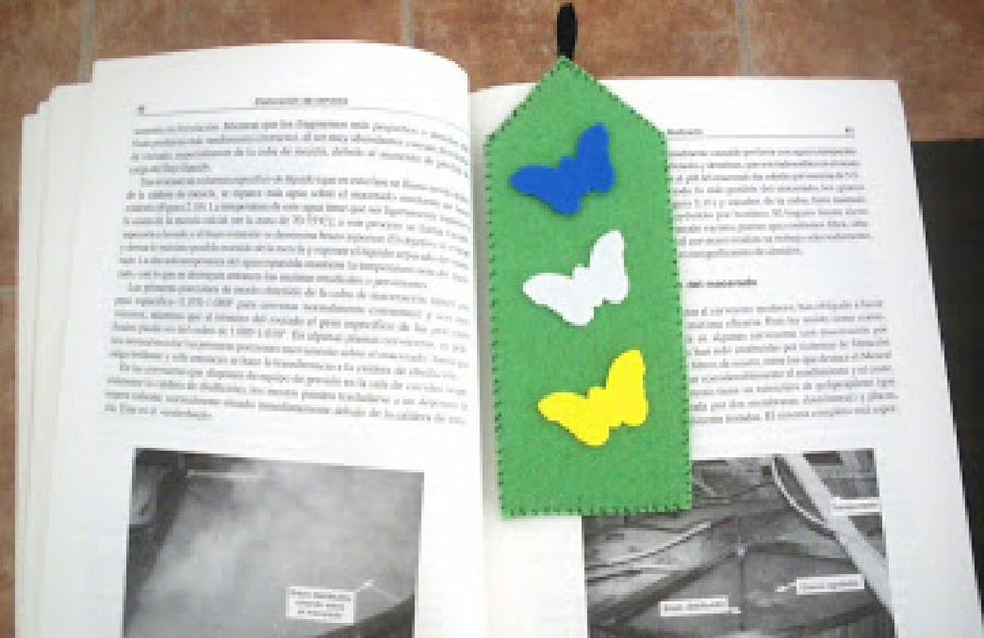 5. Y por último decoramos el marcapáginas. En este caso con unas mariposas de goma eva. Si lo queréis hacer con fieltro, se debe d coser antes de unir los dos rectángulos para que no se vena los remates por detrás.