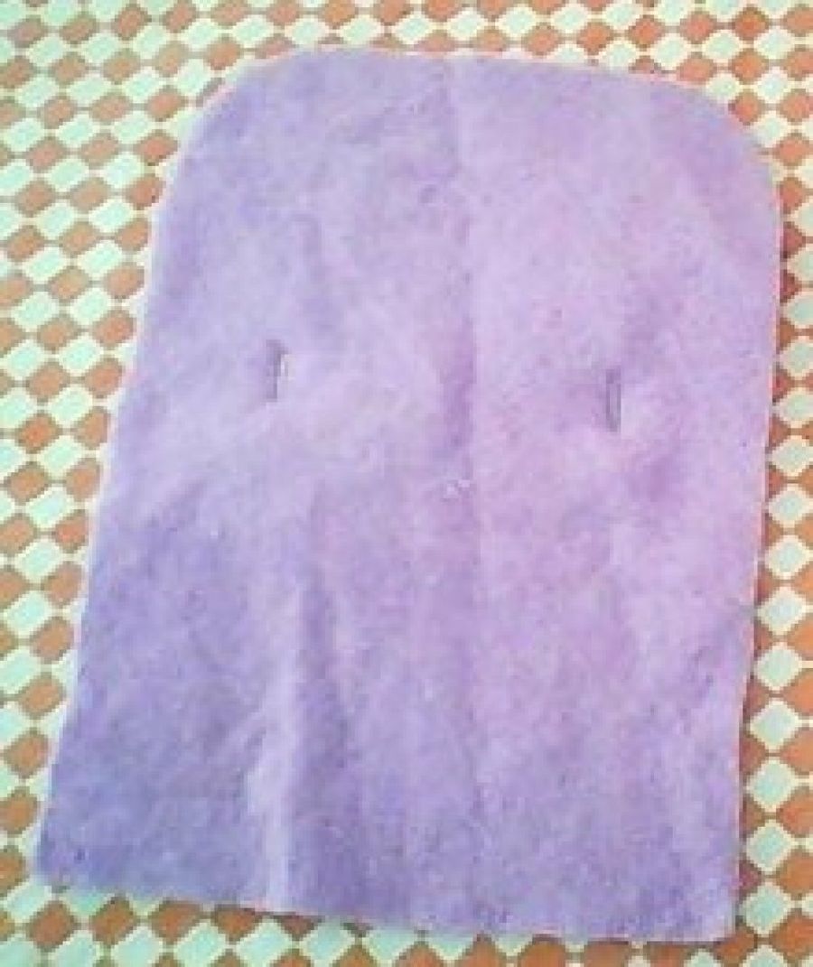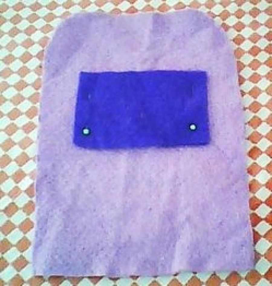 2. Pondremos esa plantilla sobre el fieltro y cortaremos dos rectángulos iguales. Ponemos la cartulina sobre uno de ellos y recortamos unos 3mm alrededor para que el fieltro quede más grande y podamos coser bien el fieltro. La plantillas de cartulina quedará dentro para que tenga más firmeza.
