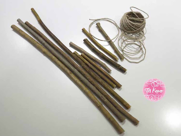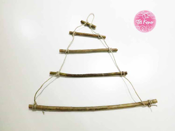 Ahora vamos a atar las ramas unas con otras con una cuerda de cáñamo, comenzamos por la de más abajo para poder dejar en la parte de arriba del árbol un poquito de cuerda del que colgarlo en la pared. Vamos haciendo un par de nudos en cada rama y tiramos cuerda. Así hasta atarlas todas.