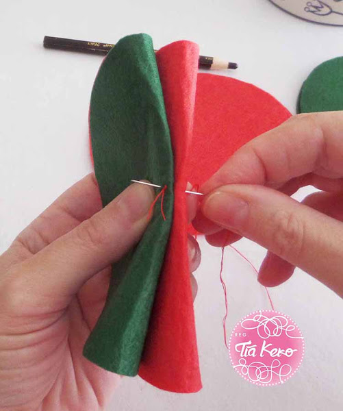 Cuando tenemos dos mitades cosidas, las doblamos de nuevo por la mitad y en cada extremo cosemos otros dos círculos también doblados por la mitad, lo veis bien en la imágen?