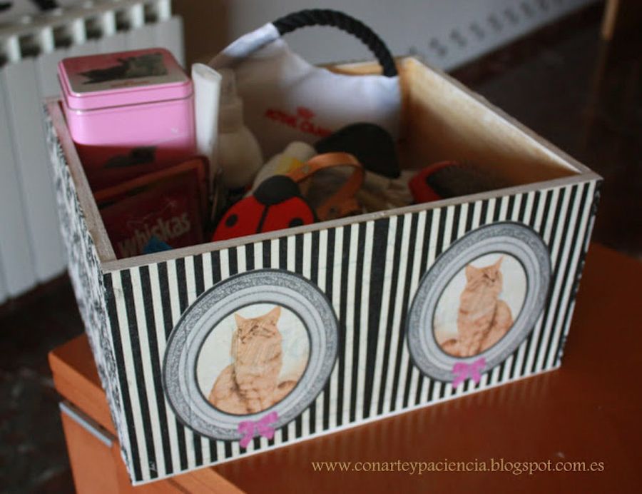 La usuaria Isabel86 ha retocado esta vieja caja de vinos y la ha aprovechado para almacenar los utensilios de uso diario de su gato. Sobre unas servilletas de estampados negros y blancos ha colocado unos adornos con imágenes de felinos que le harán juego con el resto de la obra.