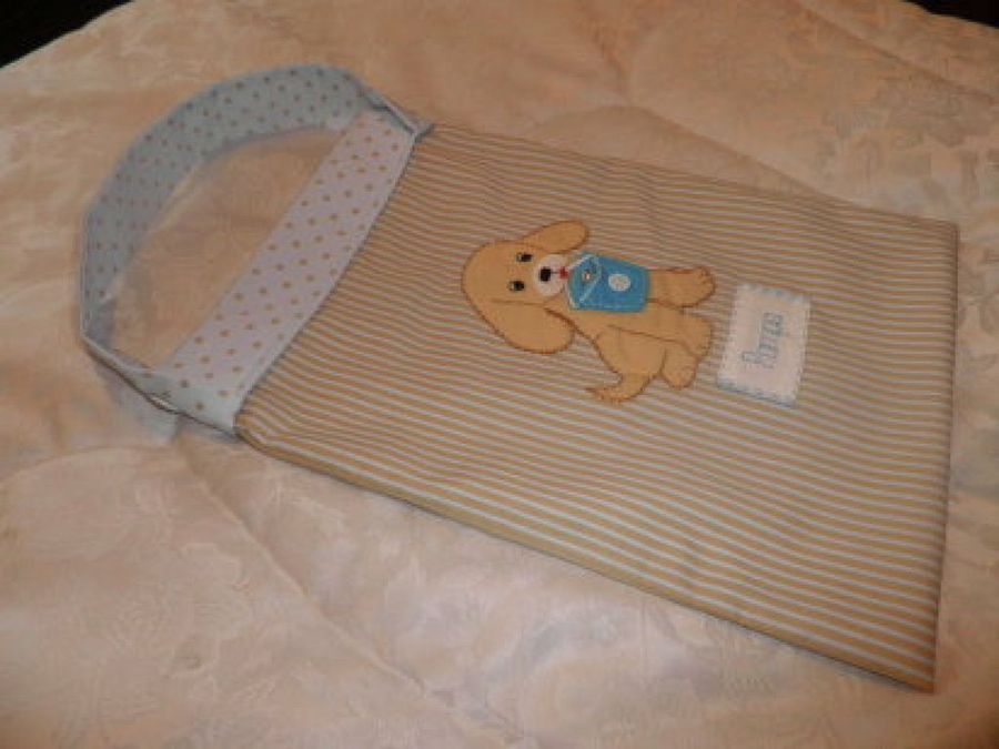 La lectora Ovelisca ha optado por fabricar un saco para una amiga donde tener recogido todos los objetos de sus perro. Está hecho con fieltro y en la parte delantera muestra un hermoso cachorrito. Debajo de éste, aparece bordado su nombre. Además, se puede colgar de donde queramos gracias a su asa.