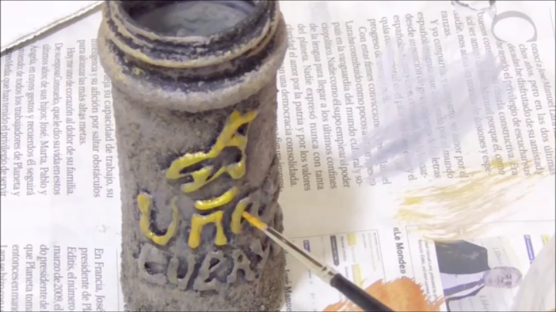 Una vez que hayan secado completamente los pitantamos para darle un acabado parecido a la piedra esto se consigue pintando de negro primero y cuando seque pasarle pinceladas de color gris y algunos toques metalizados. Las letras las repasamos con un color que contraste como el blanco, amarillo o algun color metalico