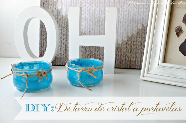 Siempre con unos botes de cristal, desde el blog El rincón de las cosas bonitas nos enseñan a hacer estos portavelas azules tan marinos, me imagino de estar en una casa en la playa ¿verdad?