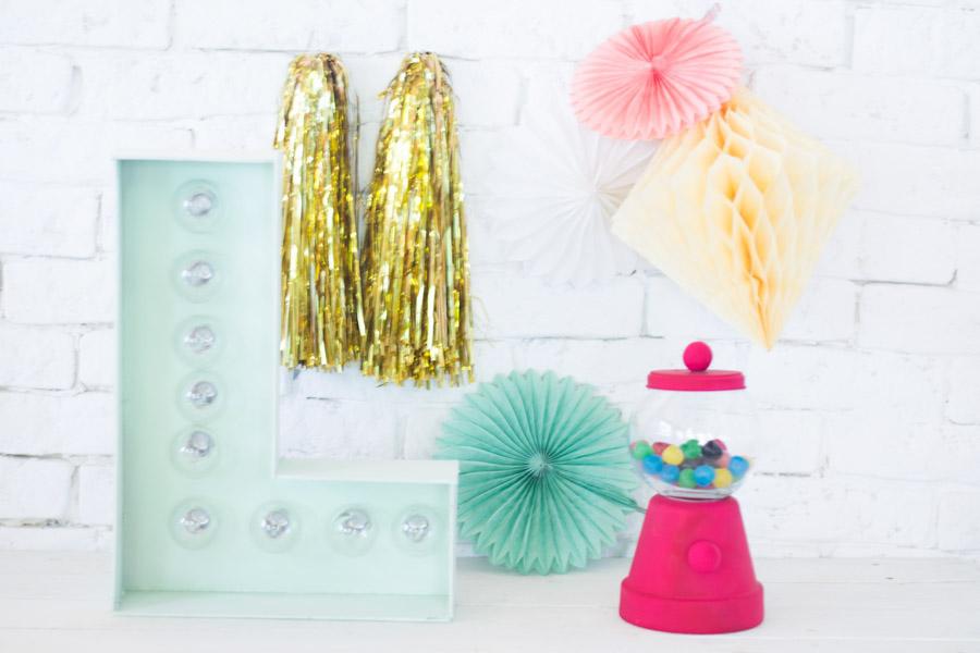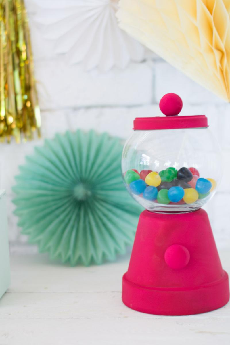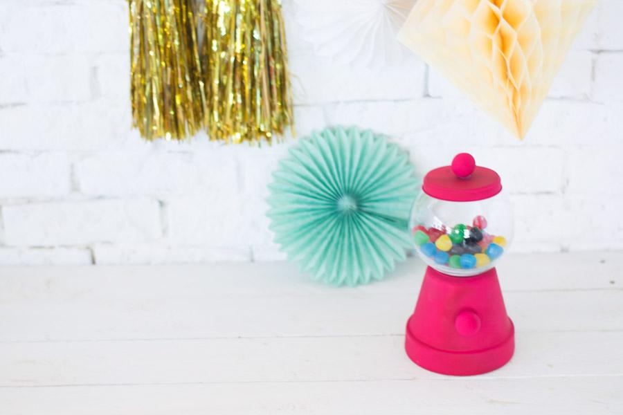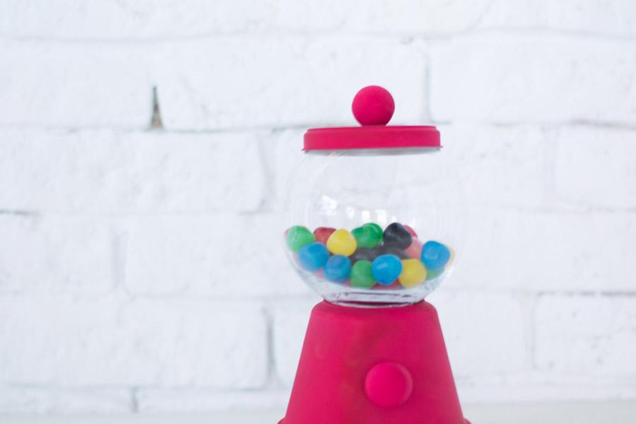 Llenamos con los caramelos de colores la esfera de cristal y la pegamos en la base de la maceta. Como ves es una elemento decorativo y funcional, ya que solo tienes que abrir la tapa y tendrás a mano las gominolas y caramelos que sobran de cada celebración en casa.