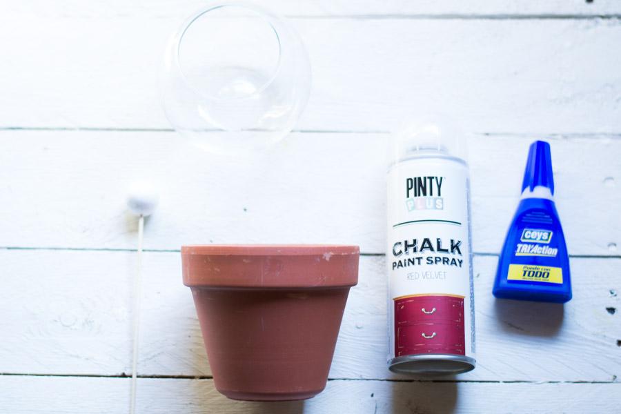 Materiales: Macetero pequeño, tapa de bote, 2 bolas redondas, pintura, cola o pistola de silicona, caramelos o gominolas y una esfera de cristal.