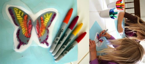 Coloca la plantilla abajo y para que no se mueva usa cinta adhesiva. Y dibuja la mariposa, pintarla como quieras.