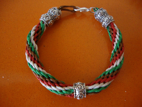 Yo sigo enganchada con el disco kumihimo trenzando pulseras, vamos, lo que se dice viciadita.... Son tan fáciles y se hacen tan rápido que no hay manera de parar. Y eso que de momento sólo estoy utilizando ocho cabos, porque este tipo de trenzado se puede complicar bastante, añadiendo muchos más hilos y más colores.