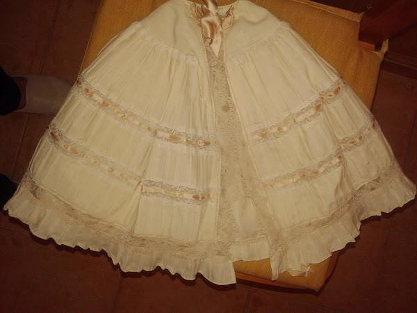 1 metro para el faldón y 1 metro para la enagua que cortaremos con el mismo patrón alargamos éste con la longitud del faldón y cosemos puntilla de encaje en la base dando unos centímetros evasee en los costados; 4 botones pequeños planos, tira bordada o encaje para adornar o entredos, según modelo.