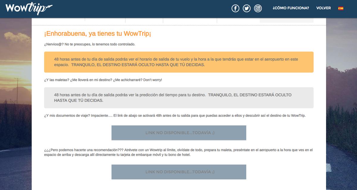 Os sigo contando. Como os decía, nosotras teníamos los Wowtrip desde julio y, no os miento, nos hemos pasado el verano con la intriga del destino. En su web, hay un espacio que se llama Mi Wowtrip en el que aparecerá toda la información pero si entras antes de tiempo no se ve nada: