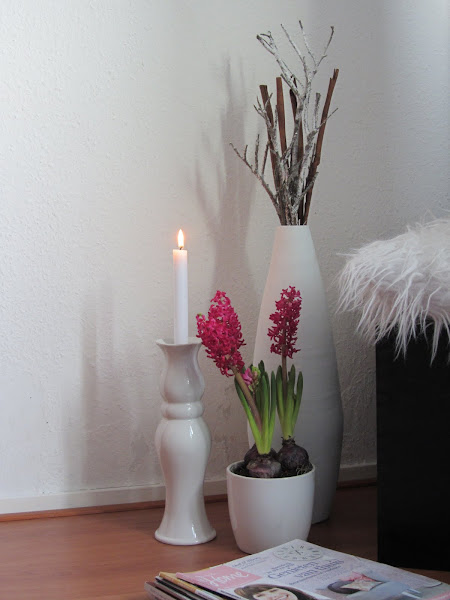 Hola a tod@s, viendo que las temperaturas están bajando nuevamente, me propuse crear un rincon cómodo y muy agradable a la vista, empecé por colocar un jarrón blanco con rramitas secas y tres barras de canela, luego lo complemente con un candelabro solitario, el toque de color lo hice con unos jacintos, que proporcionan junto con las canelas un agradable olor al ambiente.Con mi silla de verano, ...