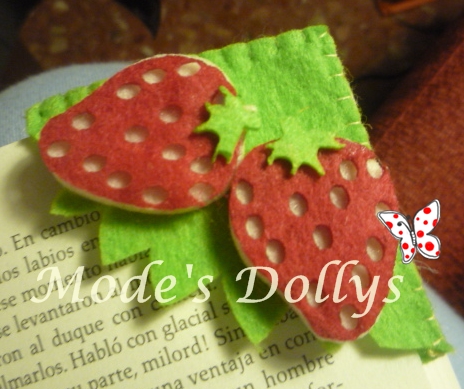 Una idea diferente de marcador de libros, y muy sencilla de hacer... tomando como referencia la esquina de la página y cosiendo dos lados, podéis echarle imaginación y hacerlo de las formas que queráis y con la decoración que se os ocurra. Yo, fresones, frescos y deliciosos. Así no pierdo el hilo de dónde me quedé en el libro que estoy leyendo ahora.